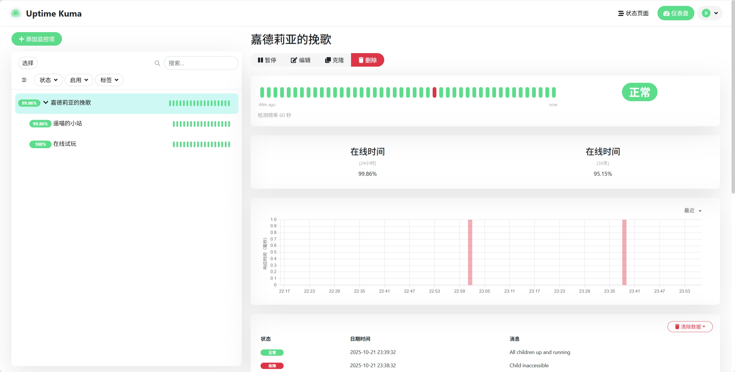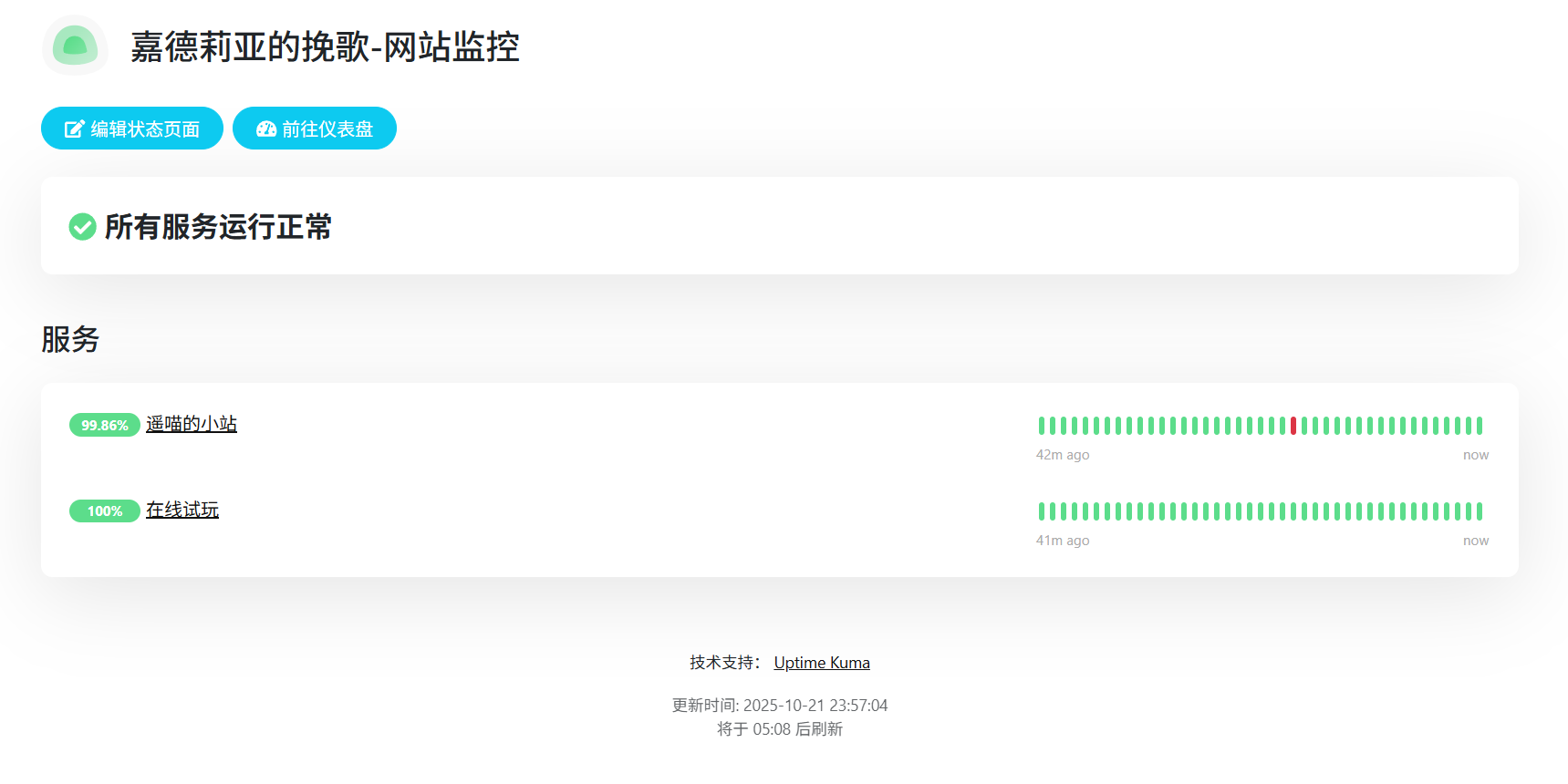 因为把停车管理系统从 狗云香港服务器 上迁到了Cloudflare,于是闲置下来部署了Uptime Kuma服务用于监控部署的各个网页,这下可以方便的查看 Gardeniatale 的网页服务可用性了,详见链接:嘉德莉亚的挽歌-网站监控